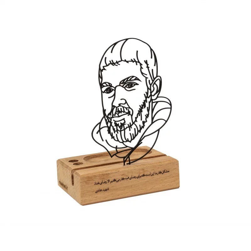 در هر مسیری که قدم بگذاریم، همیشه به انگیزه و الگویی نیاز داریم که در مسیر نگهمان دارد. و چه انگیزهای بهتر از شهدا و کلام نورانیشان. اگر از اون دسته افرادی هستید که به واسطه تحصیل و شغلتان، با میز کار یا تحریر سر و کار دارید، استند شهدا یک محصول چند کاربردی برای شما میتواند باشد. چون علاوه بر اینکه فضای شما را به تصویر و کلام شهید متبرک و مزین میکند، وسیلهای است برای نگهداری اکسسوری، خودکار و کاغذهای یادداشتتان. روی این استند تصویر شهدا باظرافت خاصی با استفاده از فلز طراحی شده و روی پایه چوبی این کار، جملهای از شهید حک شده است. همچنین این استند توسط سید احمد باقریان طراحی شده است .