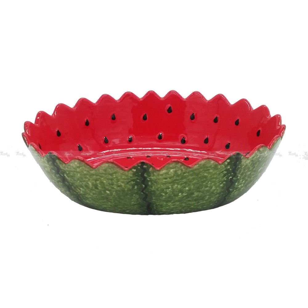 کاسه بیضی هندوانه در اندازه بزرگ و با لبه های دالبوری شکل طراحی شده است و بدنه ای پوشانده شده با لعاب درخشنده و خوش طرح هندوانه ای دارد که علاوه بر زیبایی که به محصول بخشیده است به حفظ کیفیت و دوام آن نیز کمک کند. لبه های دالبوری بسیار زیبای این کاسه هندوانه ای در کنار نقوش برجسته طرح دانه های هندوانه و تلفیق آنها با رنگ های قرمز و سبز موجب چندین برابر شدن زیبایی محصول شده است و این تکه را در کنار دیگر ظروف هندوانه ای به یکی از محبوب ترین سرویس های پذیرایی طرح میوه ای در بین خانم های خوش سلیقه تبدیل نموده است. بدنه ی مقاوم و طراحی بسیار زیبای این کاسه به شما در نگهداری، پذیرایی و سرو انواع آجیل،میوه، مغزیجات و … کمک میکند. همچنین شما میتوانید این کاسه سرامیکی هندوانه ای را با دیگر ظروف طرح هندوانه ای عرضه شده توسط این فروشگاه ست نموده و یک تم ویژه و میوه ای را برای ظروف پذیرایی خود در شب یلدا داشته باشید.