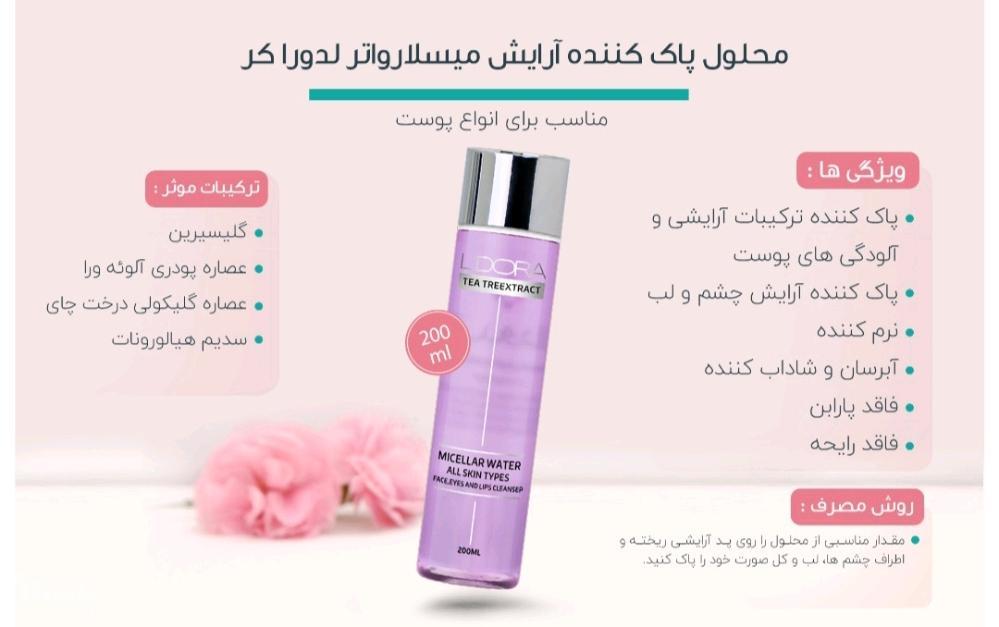 محلول پاککننده آرایش میسلار واتر یک پاککننده مناسب برای آرایش صورت، چشم و لب است. این محصول حرفهای پوست را تمیز کرده و با داشتن ترکیبات ضدالتهاب و آبرسان از جمله روغن درخت چای و سدیم هیالورونات رطوبت طبیعی پوست را حفظ کرده و به نرمی و لطافت آن کمک میکند. این پاککننده از ایجاد حساسیت و التهابات پوستی نیز پیشگیری میکند.