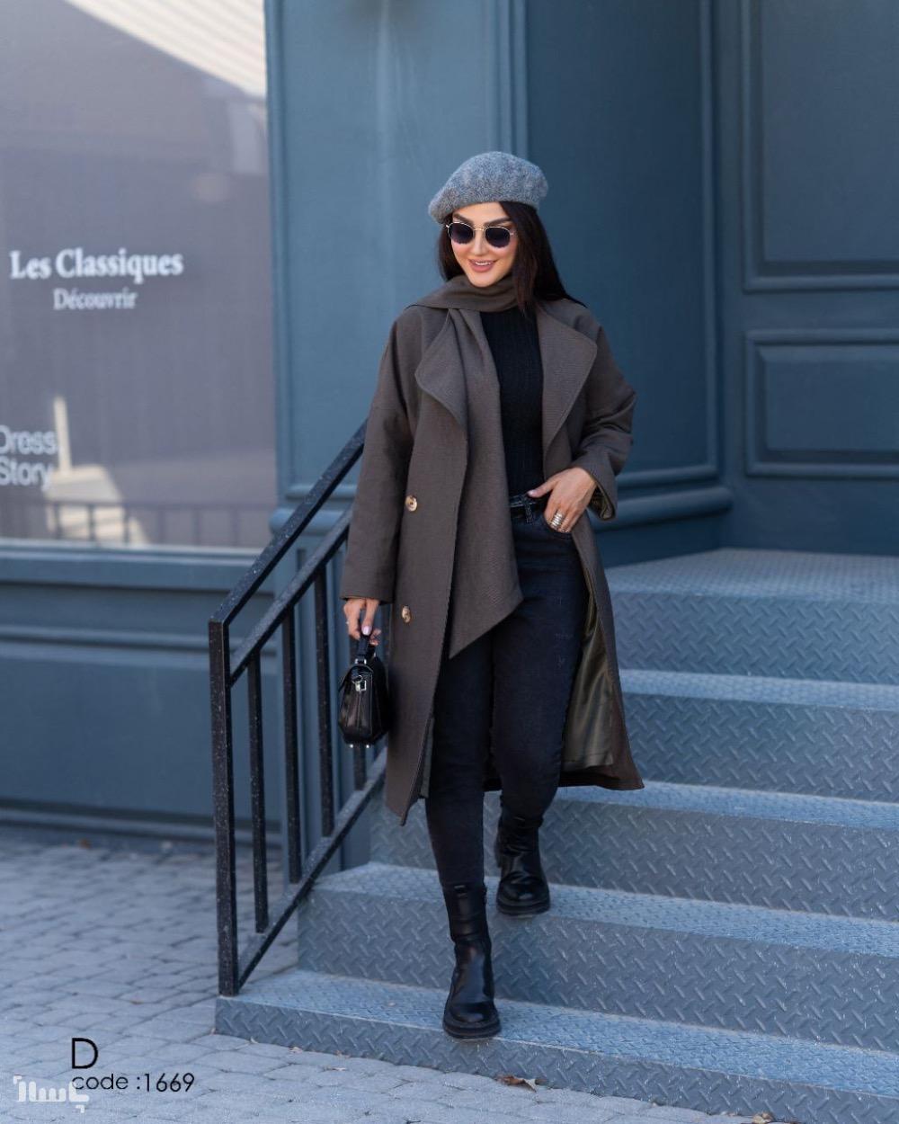 شال روی کار به پشت یقه دوخته شده و استایل خاصتری به پالتو داده