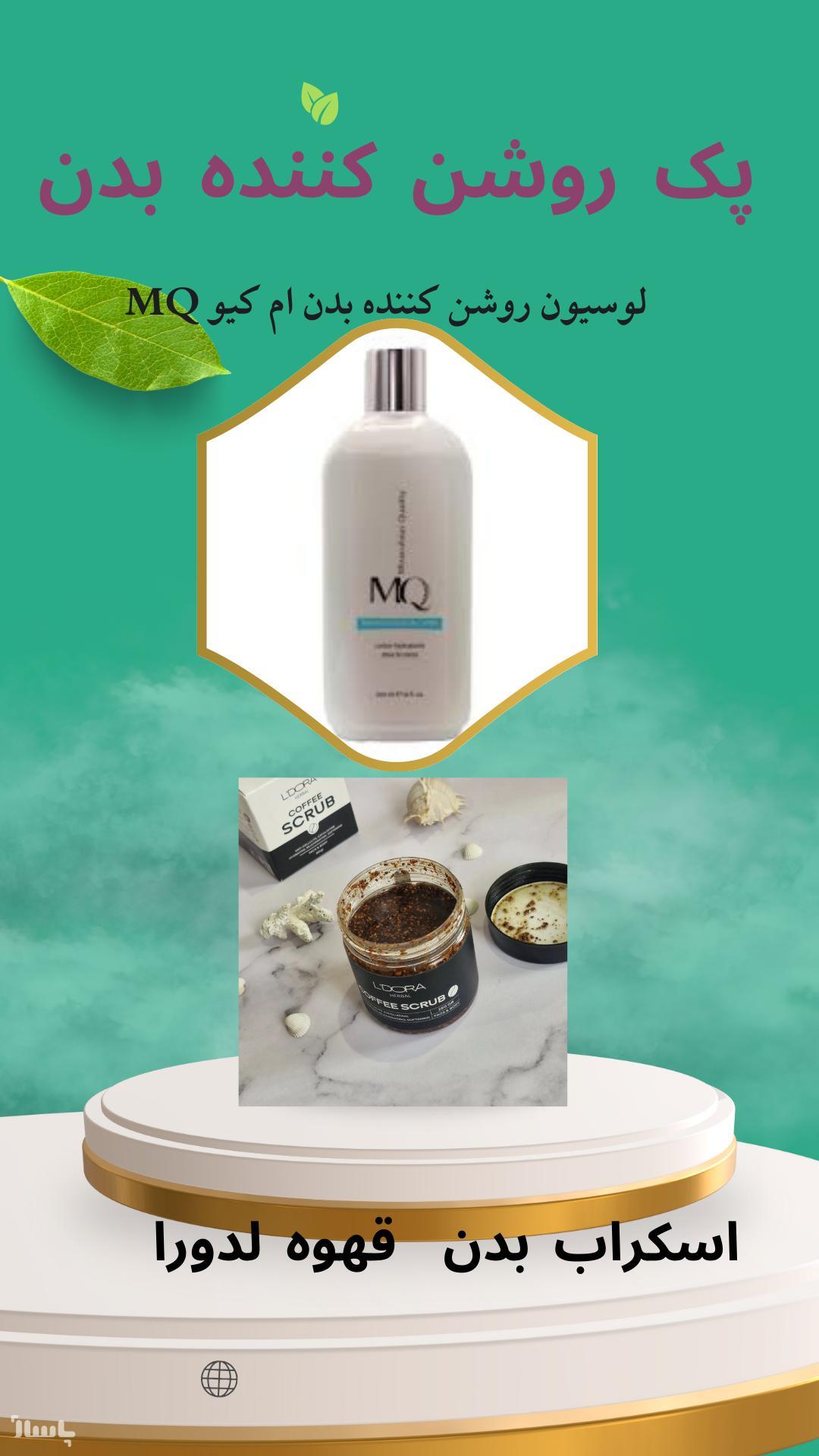 پک لایه بردار وروشن کننده نقاط تیره بدن شامل لوسیون روشن کننده نقلط تیره بدن ام کیو MQ واسکراب قهوه لدورا