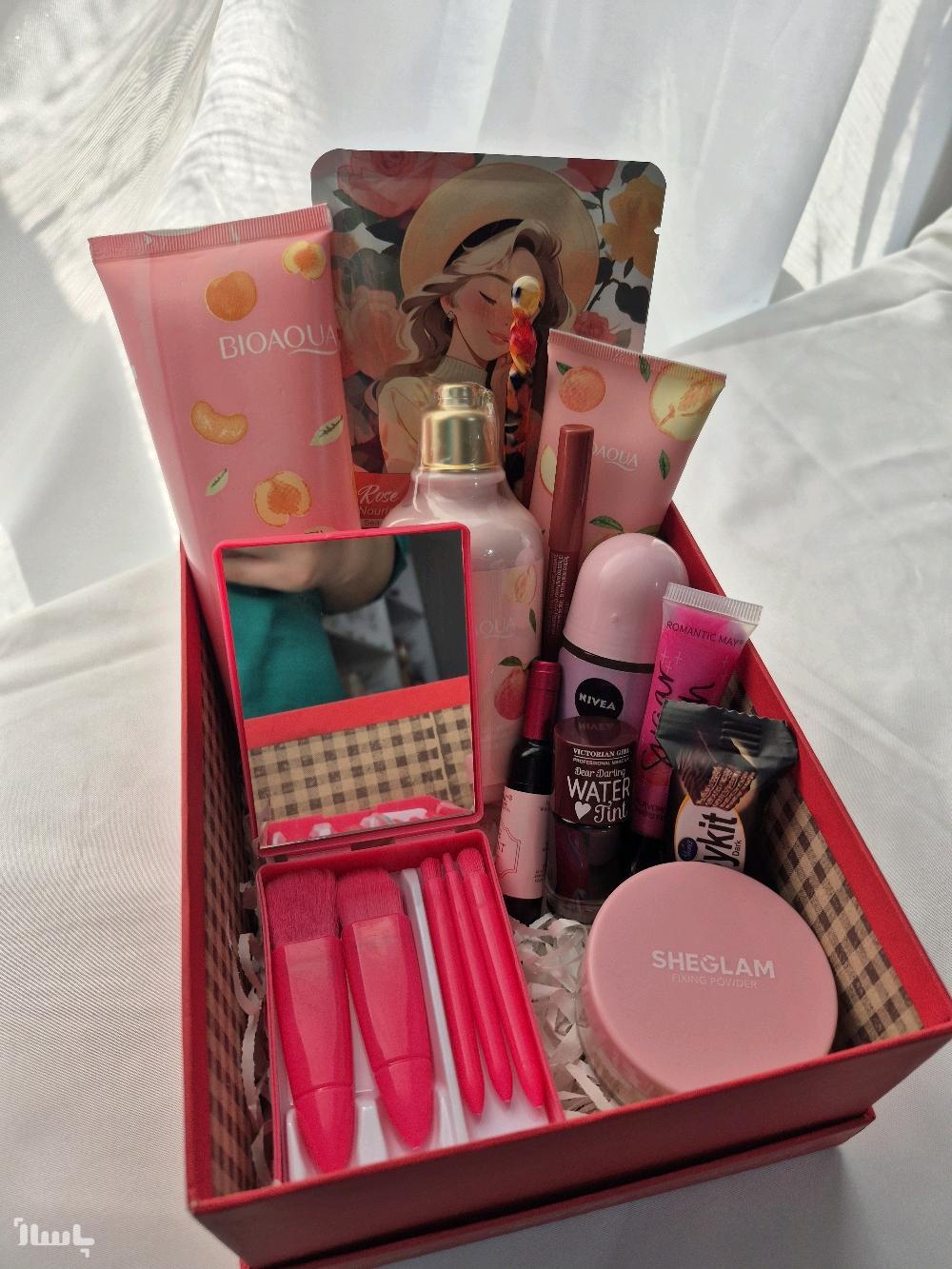 آیتم ها : نمک بدن، لوسیون بدن ،فوم شستشو ،کانزاشی ،ماسک ورقه ای، مام ،رژ مدادی،لیپ گلاس،تینت شامپاینی،تینت ،ست براش و اینه ، پودر فیکس شیگلم، بایکیت ، باکس و پوشال