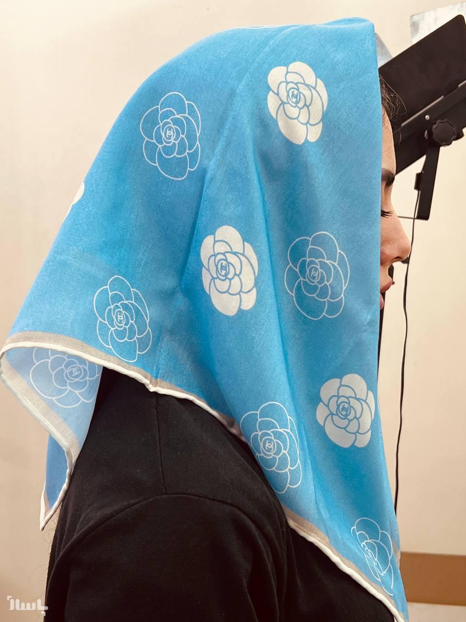 مینی اسکارف دست دوز گل گلی رنگ آبی آسمانی قواره 70