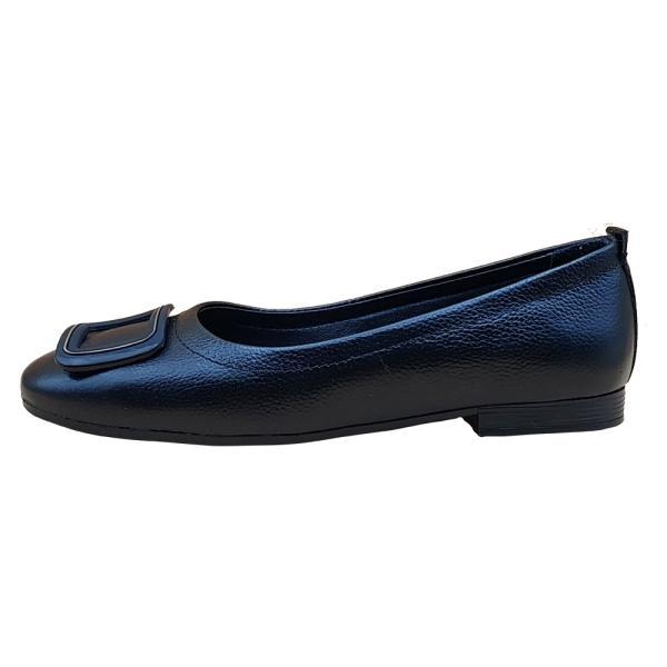 این کفش یک مدل کفش تخت زنانه با طراحی کلاسیک و شیک است. جنس رویهی آن از چرم مصنوعی یا طبیعی با بافت ریز است، و دارای یک تزئین سگکدار بزرگ روی پنجه میباشد که جلوهای مجلسی و مرتب به کفش داده است. رنگ آن مشکی مات است که آن را بسیار چندمنظوره و قابل ستکردن با استایلهای مختلف میکند.