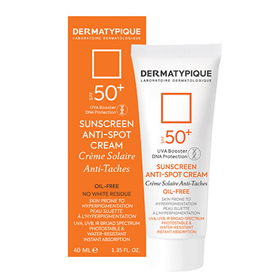 کرم ضد آفتاب ضد لک +SPF50 درماتیپیک با استفاده از فیلتر های نوآورانه، از پوست در برابر طیف وسیعی از اشعههای مضر خورشید محافظت کرده و با دارا بودن اکتیوهای ضد لک، از ایجاد لک جلوگیری کرده و به کم شدن انها کمک کمک میکند.