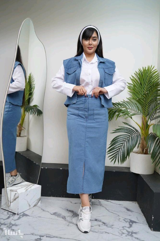 سه تیکه شومیز،جلیقه و دامن طرح جین و داکرون مدل پیچک