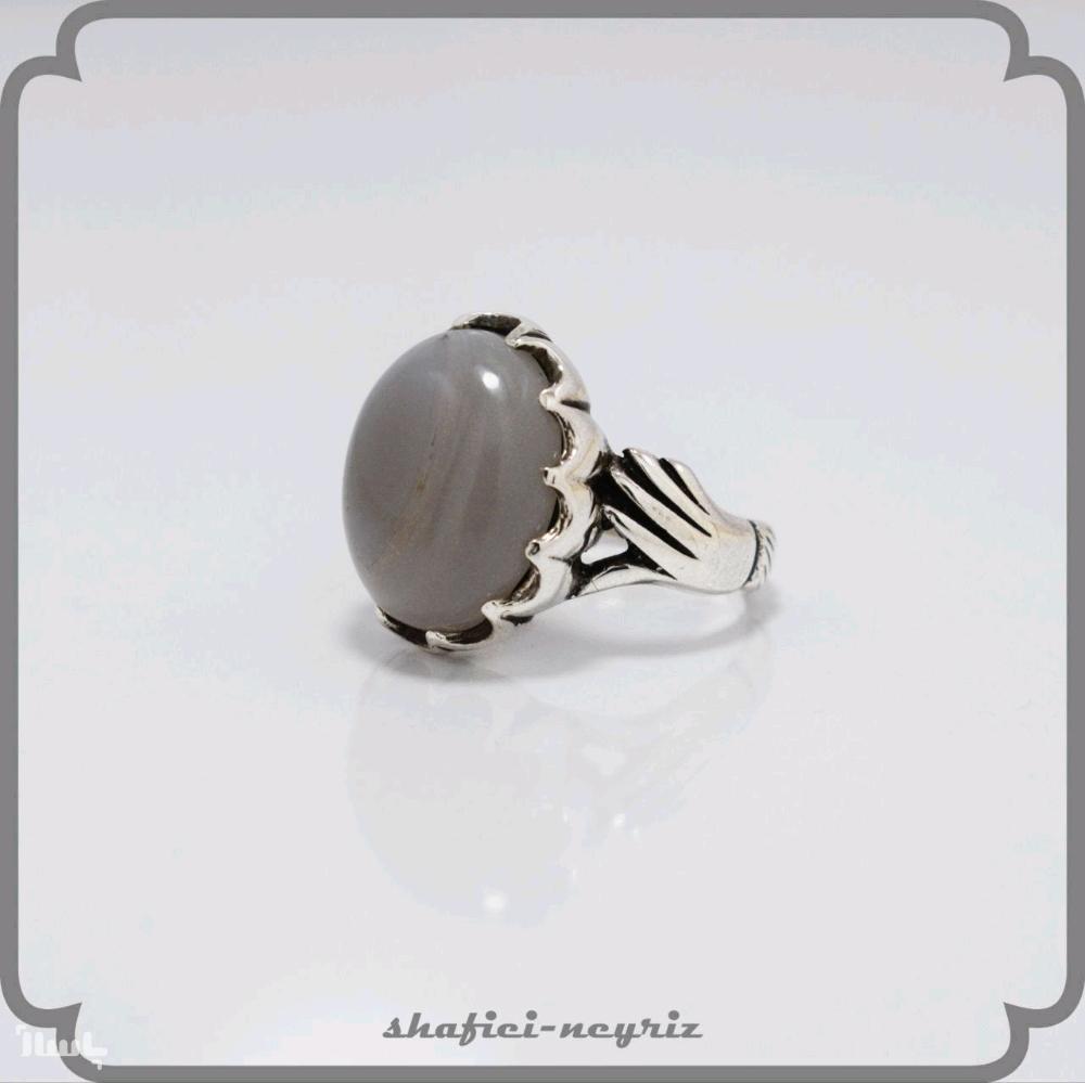 سنگ عقیق سلیمانی با رگههای طبیعی و رنگ خاکستری ملایمش، جلوهای آرام و چشمنواز به انگشتر داده.